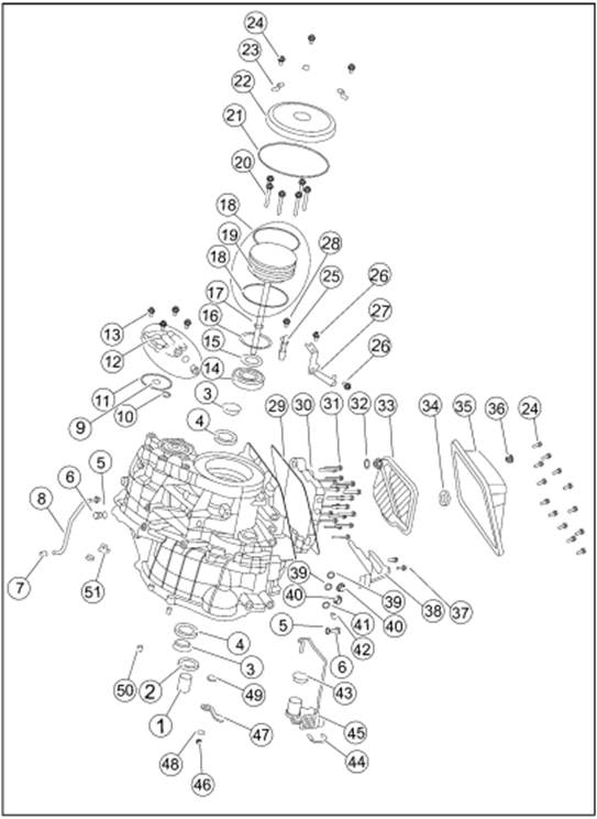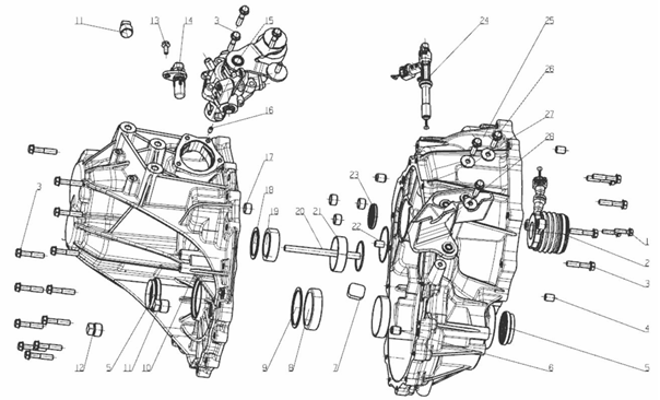 1. Shift fork sleeve (2) 2. Transmission assembly pin (2) 3. Cable bracket assembly 4. Cable bracket bolt (3) 5. Cable bracket big washer (3) 6. Engine connecting pin (2) 7. Input oil seal 8. Differential oil seal 9. Differential right bearing outer ring 10. Magnet 11. Countershaft right bearing outer ring 12. Countershaft oil collecting tray