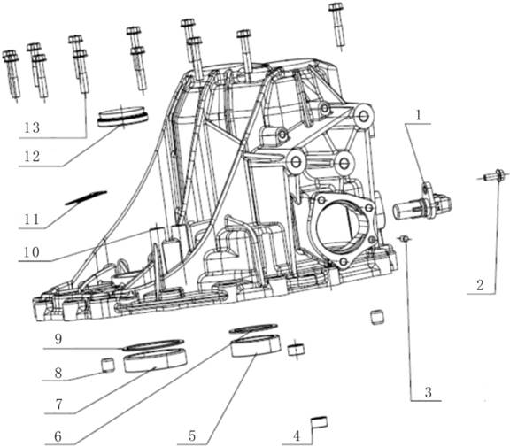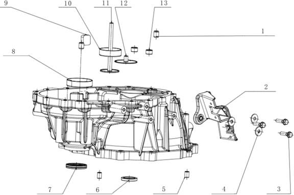 As shown in the figure below, after removing the transmission assembly bolts (12) on the left transmission body, take down the clip on the bolt; then remove the neutral signal sensor bolt, take down the neutral signal sensor; remove the left transmission body differential oil seal with the oil seal puller (Note: scrap the oil seal, and it cannot be used again); then remove the gear shifting case locating pin (Note: scrap and cannot be used again); turned around and transmission body, remove the countershaft left bearing outer ring and differential bearing outer ring with inertia hammer; finally remove the shift fork sleeve of forward gears and reverse gear fork fork rod hole (Note: scrap and cannot be used again).