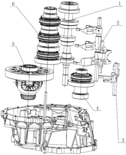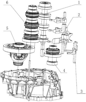 1. Input shaft assembly 2. Forward gear shifting fork assembly 3. Reverse gear shifting fork assembly 4. Reverse gear shaft assembly 5. Differential assembly 6. Intermediate shaft assembly
