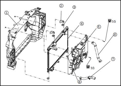 7 Remove the fixed bolt of radiator assembly and radiator fan assembly , and separate the above parts.
