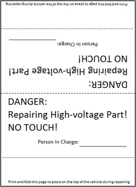 Before repairing high-voltage parts, please place “Repairing High-voltage Parts, No Touch” warning sign on the prominent position of the repaired vehicle to remind other people.