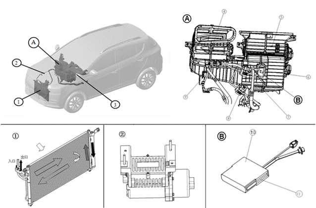 Air conditioner host is composed of blower, temperature damper motor, module damper motor, internal and external air damper motor, speed regulating module, electrical heater and other parts.