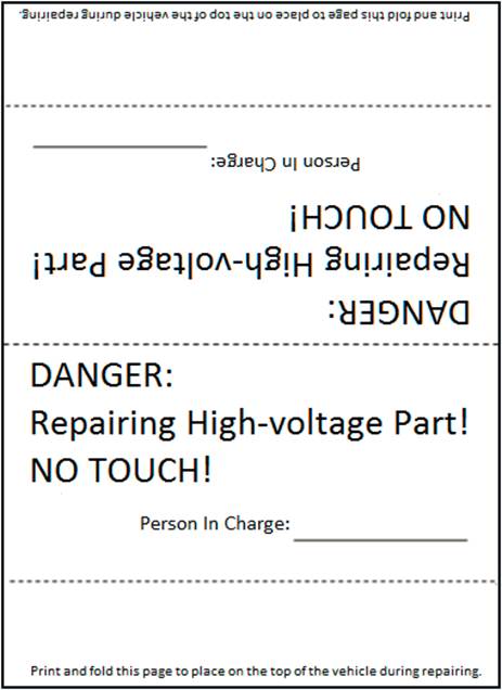 Before repairing high-voltage parts, please place “Repairing High-voltage Parts, No Touch” warning sign on the prominent position of the repaired vehicle to remind other people.
