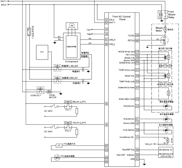 Wiring malfunction: 1)Check blower motor wiring and confirm whether connectors are loosen. 2)Replace fuse if it is fell off or damaged. 3)Replace relay if it is damaged. |