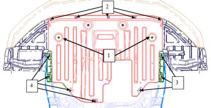 1 Open engine cover, support with supporting pole, dismantle opening device of charging interface(refer to the dismantle requirement of opening device of charging interface). Remove the 21 expansion buckles(5522101U2152) on the upper、side and lower part of front bumper illustrated in diagram 1 and the two hex T-shaped screws (12442-0520F71)illustrated in diagram 2. Tools: cross screwdriver and straight screwdriver.