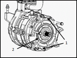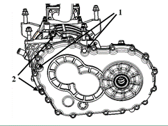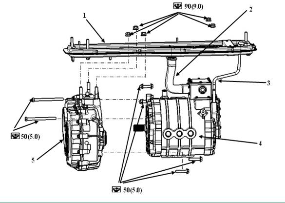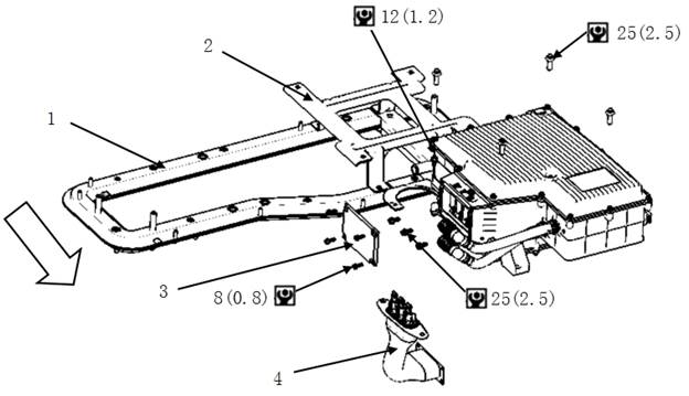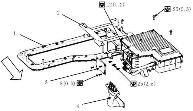 (Bolt Q15010105, spring pad Q40110, flat pad Q40110 combination) 1, bolt assembly 2 (bolt Q15010105, spring pad Q40310, flat pad Q40110 combination), the bolt assembly 1, bolts (Q1841050) plus nut (Q33010) combination of two and bolts (Q1841050) 2 will drive motor and reducer connection fastening, tightening torque ■ 45 ~ 50Nm, as shown below