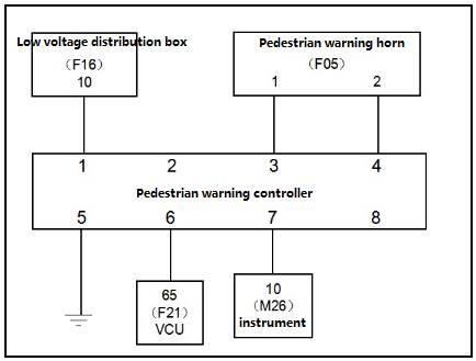 ● Pedestrian warning controller receives, judges, handles signal from VCU and sends phonation signal to pedestrian warning horn.