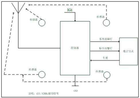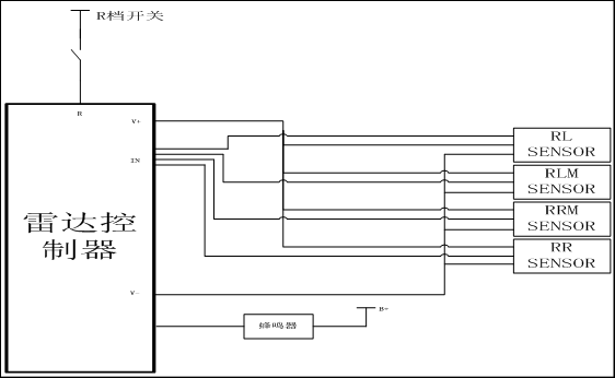 The reversing radar system consists of a sensor, a control module and an alarm device. The reversing radar system is based on the principle of ultrasonic distance measurement and computer data blur processing technology to determine whether there are obstacles in the reversing direction of the car, and to indicate the distance of the nearest obstacle. When the operating gear is hung in the reverse gear, the reverse switch is turned on, and the reverse light is on. After the controller receives the reverse signal, the ultrasonic sensor is controlled to send an ultrasonic signal, and the principle of the sensor self-receiving and multiple-receiving is used to accurately and completely return the echo signal. Passed to the controller, after analysis and processing by the controller, it is determined that there is an obstacle in the detection distance and the distance of the nearest obstacle, and the buzzer in the combination meter is controlled to issue an alarm sound, and different frequencies are emitted according to different distance ranges. The tweet reminds the distance of the obstacle and achieves the security warning function.