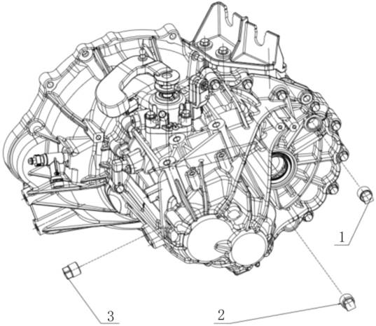 As shown in the figure below, loosen and remove the oil filling screw plug, the oil level screw plug and the oil drain bolt to release the transmission oil;